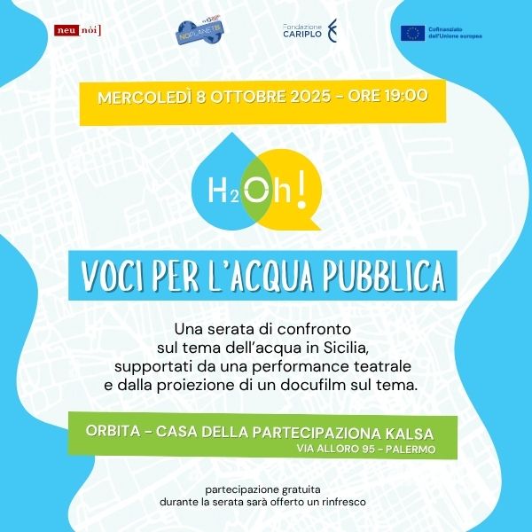 All’interno del progetto H2Oh! – La verità sull’acqua pubblica a Palermo, vi invitiamo a una serata speciale di teatro, cinema e confronto collettivo sul tema dell’acqua pubblica in Sicilia.